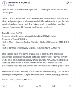 रेलवे ने फंसे हुए यात्रियों को निकालने का कवायद शुरू कर दी है। रेलवे ने श्री माता वैष्णो देवी कटरा और दिल्ली के बीच स्पेशल ट्रेन चलाने का निर्णय लिया है। यह ट्रेन कटरा से नयी दिल्ली के लिए बुधवार रात 9:20 बजे रवाना होगी। एयरलाइन्स कंपनियों द्वारा भी श्रीनगर एयरपोर्ट से कुछ विशेष उड़ानें शुरू किए जाने की खबर है।