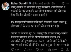 जम्मू-कश्मीर के मुख्यमंत्री उमर अब्दुल्ला ने पहलगाम में हुए हमले को लेकर दुख जताया है। उन्होंने कहा कि पर्यटकों पर किया गया हमला बेहद घृणित है और अपराधियों को बख्शा नहीं जाना चाहिए। राहुल गांधी ने भी पहलगाम में हुए आतंकी हमले में पर्यटकों के मारे जाने और कई लोगों के घायल होने की खबर पर दुख व्यक्त किया है।