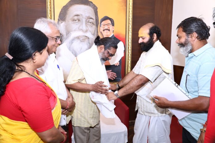 रांची, 10 अप्रैल 2025: मुख्यमंत्री श्री हेमन्त सोरेन से आज मुख्यमंत्री आवासीय कार्यालय में श्री राम जानकी तपोवन मंदिर ट्रस्ट के अध्यक्ष महंत श्री ओम प्रकाश शरण एवं सदस्य श्री प्रणय कुमार, श्रीमती प्रीति वर्मा, श्री अयोध्या दास तथा श्री मिथिलेश कुमार ने शिष्टाचार भेंट की। इस अवसर पर उन्होंने मुख्यमंत्री को 14 अप्रैल 2025 को श्री राम जानकी तपोवन मंदिर के नवनिर्माण हेतु आयोजित होने वाले शिला पूजन कार्यक्रम में शामिल होने के लिए आमंत्रित किया।