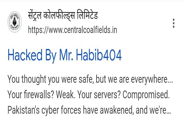 सेंट्रल कोल फील्ड (सीसीएल) की आधिकारिक वेबसाइट को हैकरों ने हैक कर लिया है। हैकर ने वेबसाइट पर अपना दावा करते हुए लिखा है कि “पाकिस्तान के साइबर जाग गए हैं”।