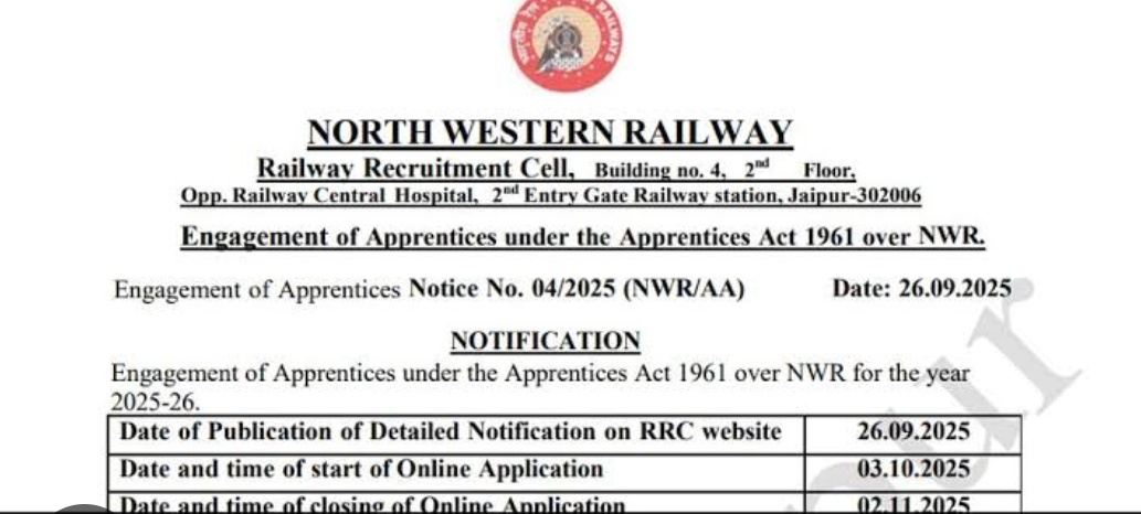 रेलवे में सरकारी नौकरी पाने का सपना देख रहे युवाओं के लिए खुशखबरी है। रेलवे भर्ती सेल (RRC), उत्तर पश्चिम रेलवे (NWR), जयपुर ने अप्रेंटिस के 2162 पदों पर भर्ती निकाली है। इच्छुक और योग्य उम्मीदवार https://www.rrcjaipur.in/ पर जाकर आवेदन कर सकते हैं। आवेदन की प्रक्रिया 3 अक्टूबर से जारी है जिसकी अभ्यर्थी 2 नवंबर तक आवेदन दे सकतें हैं। आवेदन शुल्क भुगतान करने की अंतिम तिथि भी 2 नवंबर ही है।