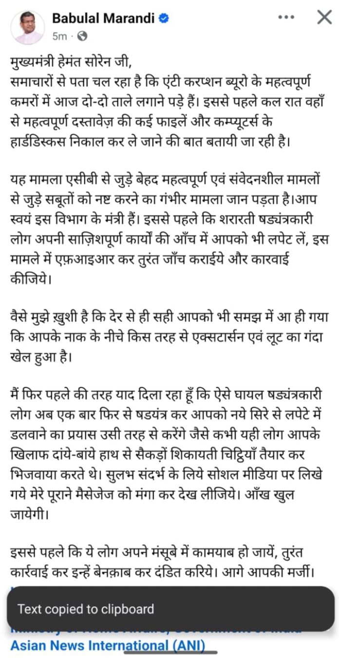 बाबूलाल मरांडी ने पांच कसते हुए अपने सोशल मीडिया पोस्ट पर यह लिखा की देर से ही सही लेकिन अब आपको भी समझ आ गया होगा कि आपका ही नाक के नीचे किस तरह से एक्सटॉर्शन और लूट का गंदा खेल खेला जा रहा है और षड्यंत्रकारी लोग आपको नए सिरे से विवादों में गिरने का प्रयास कर रहे हैं।