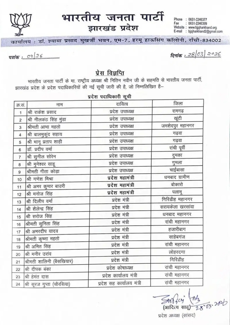 झारखंड: भारतीय जनता पार्टी झारखंड प्रदेश ने नई प्रदेश कार्यसमिति के पदाधिकारियों की घोषणा कर दी है। प्रदेश अध्यक्ष आदित्य साहू ने 28 मार्च 2026 को इस सूची को मंजूरी दी।
