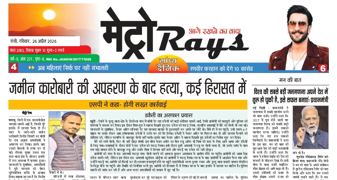 E-Paper Metro Rays E-paper 26th April 2026 Metro Rays By admin - April 26, 2026 0 20 FacebookTwitterWhatsAppTelegramKoo 26 April Pdf Joint Page Metro Rays