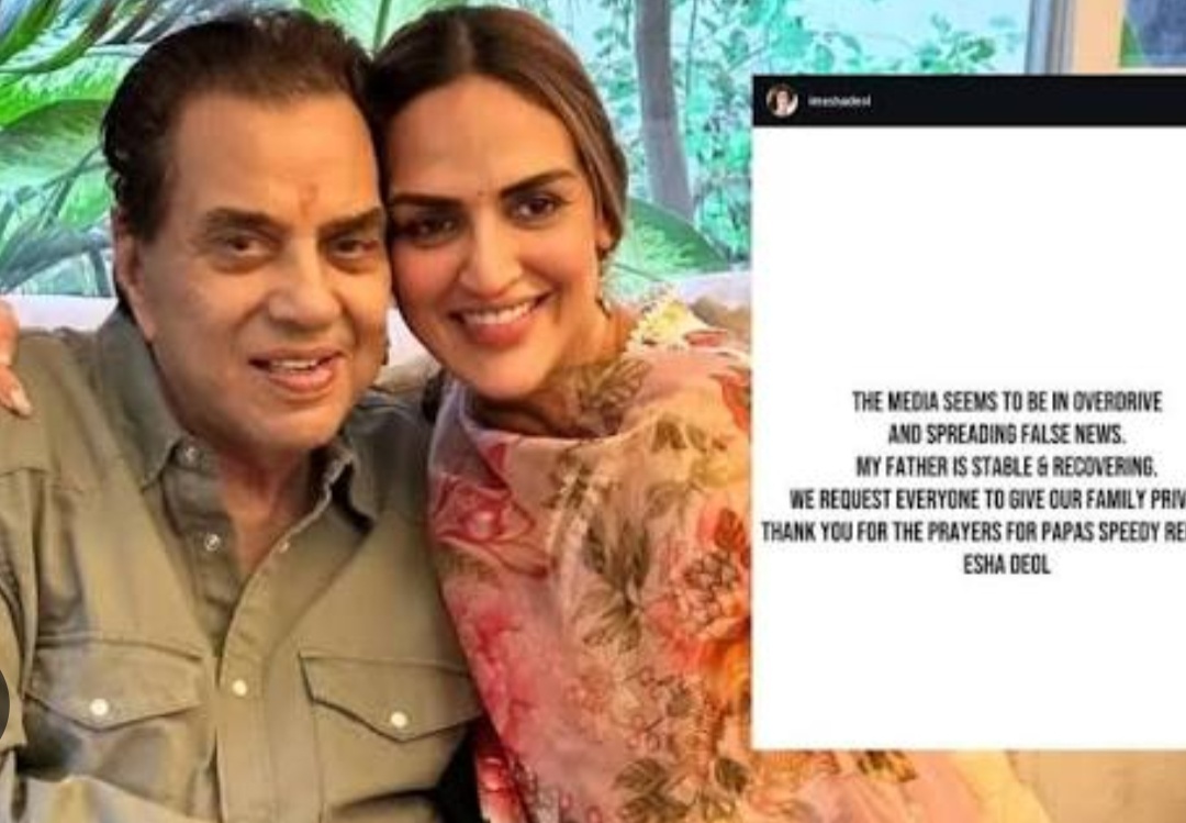 बॉलीवुड की अभिनेत्री ईशा देओल ने अपने पिता और बॉलीवुड के दिग्गज अभिनेता धर्मेंद्र के स्वास्थ्य को लेकर इंस्टाग्राम पर एक पोस्ट साझा किया है। इस पोस्ट में उन्होंने मीडिया और सोशल मीडिया पर फैली अफवाहों को खारिज करते हुए कहा कि उनके पिता स्थिर हैं और ठीक हो रहे हैं। ईशा ने अपने संदेश में लिखा है कि मीडिया गलत खबरें फैला रहा है, और परिवार को शांति और गोपनीयता की जरूरत है। उन्होंने लोगों से अपील की कि वे परिवार को प्राइवेसी दें और उनके पिता की जल्द स्वास्थ्य लाभ की प्रार्थना करें।