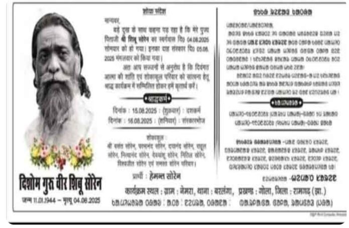 झारखंड: आदिवासी अस्मिता और झारखंड आंदोलन के प्रतीक दिशोम गुरु शिबू सोरेन का रामगढ़ के नेमरा गांव में श्राद्धकर्म कार्यक्रम का आयोजन किया जायेगा। 15 अगस्त को दशकर्म होगा। जबकि 16 अगस्त को संस्कार भोज एवं श्रद्धांजलि सभा होगा।