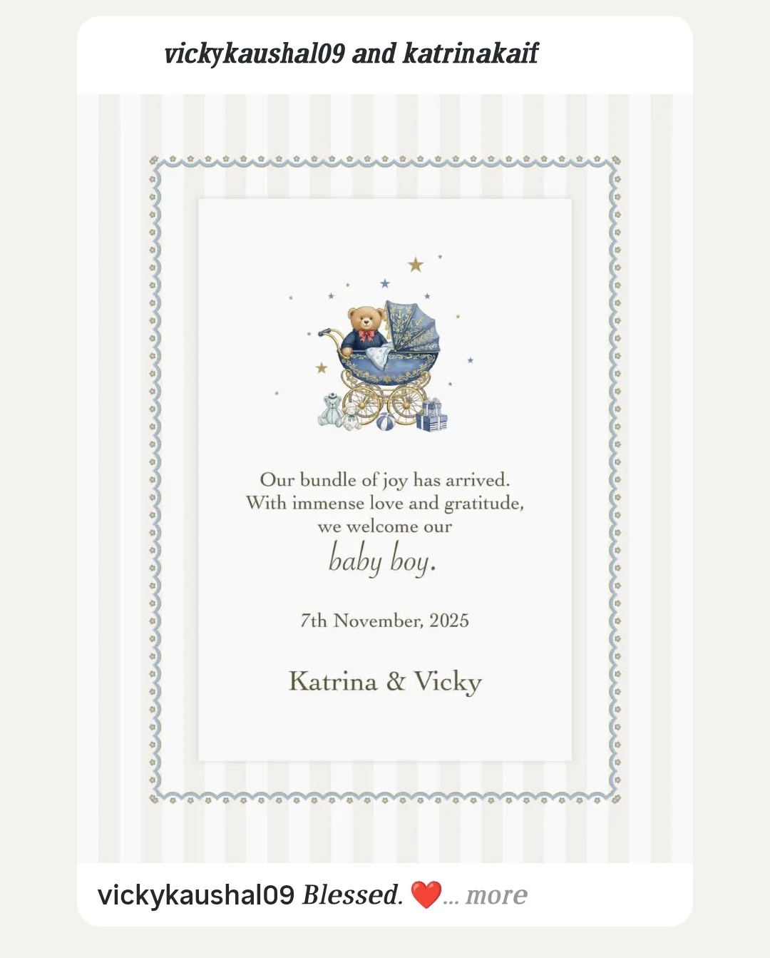 बॉलीवुड के मशहूर सितारे कैटरीना कैफ और विकी कौशल के घर खुशियों से दस्तक हुई है जिसमें यह स्टार जोड़ी ने 7 नवंबर 2025 को अपने पहले बच्चे का स्वागत किया है।