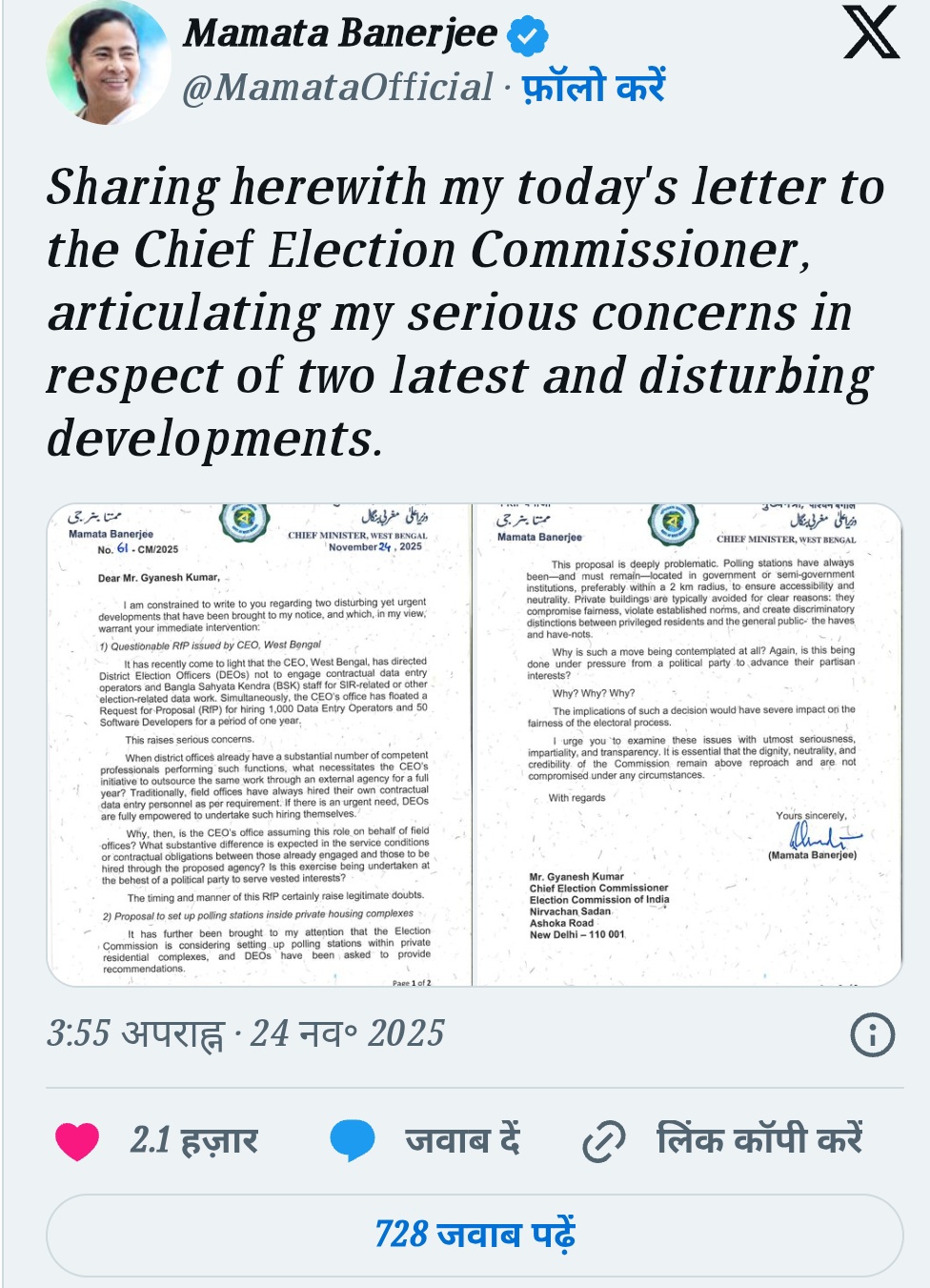 मुख्यमंत्री ममता ने पत्र में लिखा कि क्या यह काम किसी राजनीतिक दल के इशारे पर निहित स्वार्थों की पूर्ति के लिए किया जा रहा है? इसके अलावा मुख्यमंत्री ने निजी आवासीय परिसरों में मतदान केंद्र स्थापित करने के कथित प्रस्ताव पर आपत्ति दर्ज की है।