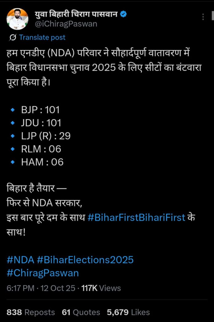 लोजपा (रामविलास) के प्रमुख चिराग पासवान ने कहा कि एनडीए परिवार ने बिहार विधानसभा चुनाव 2025 के लिए सीट बंटवारा सौहार्दपूर्ण तरीके से पूरा किया है। उन्होंने कहा, “बिहार तैयार है, फिर से एनडीए सरकार। इस बार पूरा दम के साथ, ‘बिहार पहले – बिहारी पहले’।“हिंदुस्तानी आवाम मोर्चा (हम) के प्रमुख और केंद्रीय मंत्री जीतन राम मांझी ने सीट बंटवारे पर संयमित प्रतिक्रिया दी। उन्होंने कहा कि उन्हें जितनी सीटें दी गई हैं, वह उन्हें स्वीकार है और उन्हें इसमें संतुष्टि है। मांझी ने याद दिलाया कि संसद में उन्हें केवल एक सीट मिली थी, तब भी उन्होंने कोई नाराजगी नहीं जताई थी। एनडीए के इस बंटवारे के साथ ही बिहार में चुनावी तैयारियां तेज हो गई हैं और सभी दल अपनी-अपनी रणनीतियों पर काम शुरू कर चुके हैं।