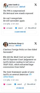राहुल गांधी ने कहा कि उनका (मोदी) विश्वासघात देश के सामने अब उजागर हो चुका है। दावा किया कि पीएम मोदी इस ट्रेड डील में फिर से सरेंडर कर देंगे।