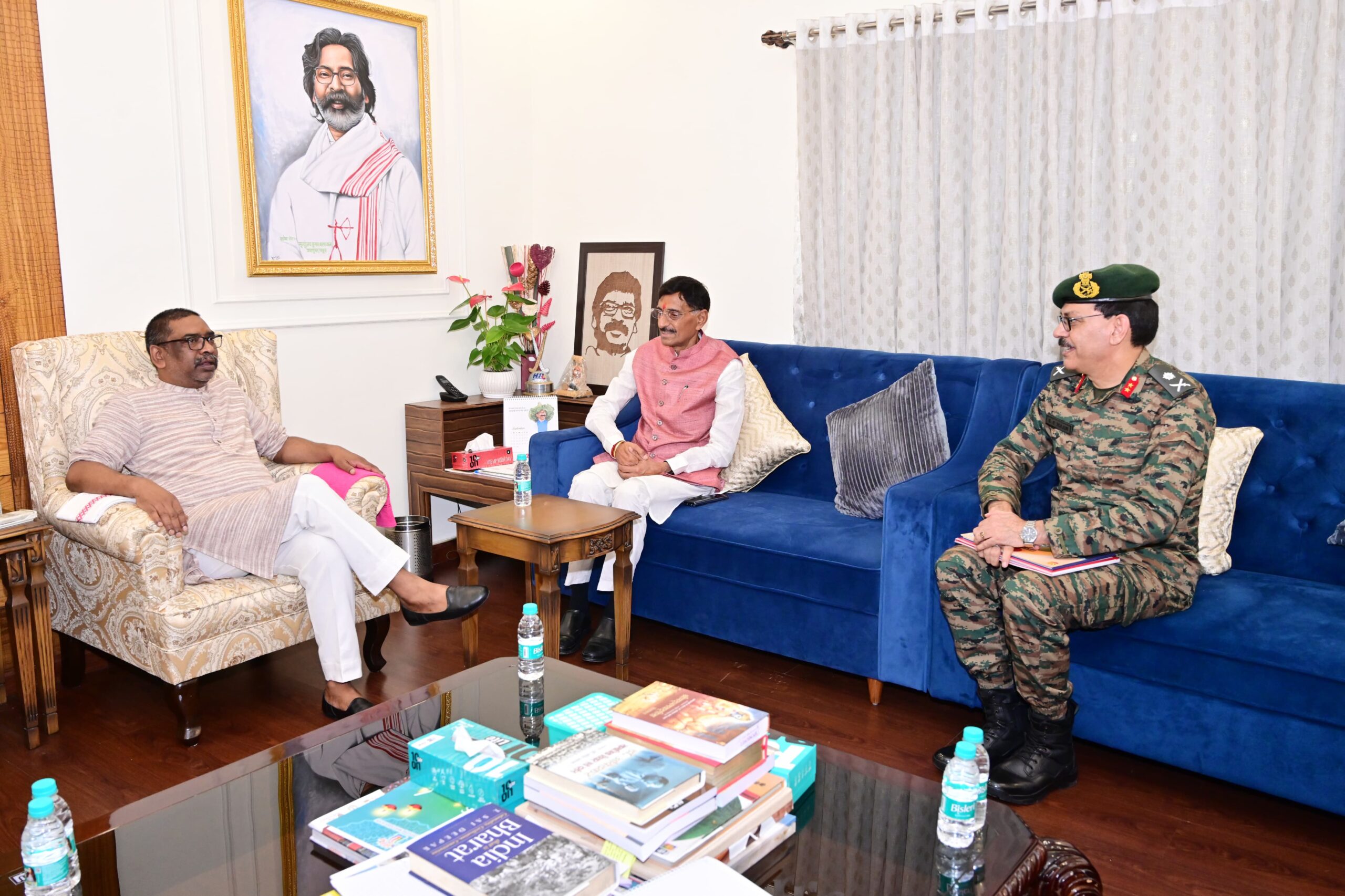 रांची: झारखंड की राजधानी रांची में आज 17 सितंबर को मुख्यमंत्री श्री हेमंत सोरेन से उनके मुख्यमंत्री आवासीय कार्यालय में केंद्रीय रक्षा राज्य मंत्री श्री संजय सेठ एवं मेजर जनरल श्री सज्जन सिंह मान ने भेट किया।