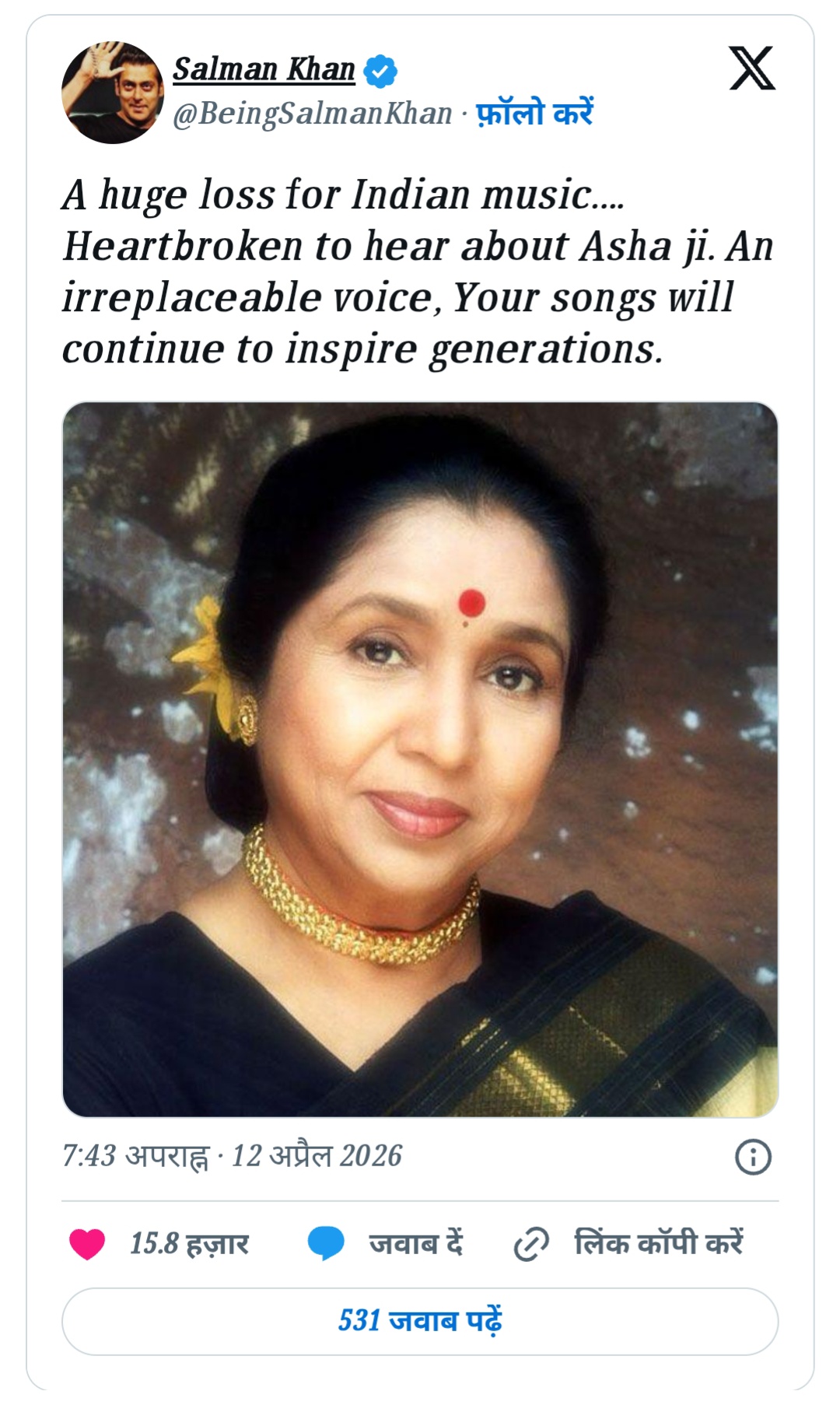 आशा भोसले के निधन के बाद बॉलीवुड के कई सितारे उन्हें सोशल मीडिया पर श्रद्धांजलि दे रहे हैं। सलमान खान ने भी अपने इंस्टाग्राम पर उनकी तस्वीर शेयर करते हुए एक इमोशनल नोट लिखा-भारतीय संगीत उद्योग ने एक अनमोल आवाज खो दी है और उनकी कमी कभी पूरी नहीं हो पाएगी। सलमान खान ने लिखा कि आशा जी के गाने हमेशा लोगों को प्रेरित करते रहेंगे और उनकी आवाज अमर रहेगी।
