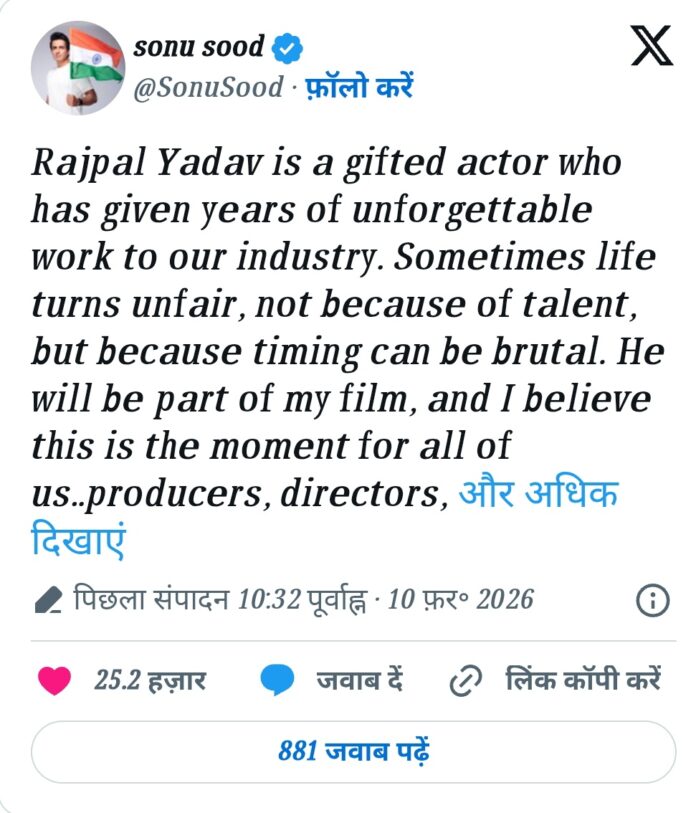 हाल ही में, सोनू सूद ने अपने एक्स पर एक पोस्ट करते हुए कहा कि राजपाल यादव बहुत टैलेंटेड एक्टर हैं और उन्हें अपनी फिल्म में शामिल करने के साथ एक छोटा सा साइनिंग अमाउंट भी दिया जाएगा। उन्होंने साफ किया कि यह मदद किसी तरह की चैरिटी नहीं, बल्कि, प्रोफेशनल सम्मान और सहयोग का प्रतीक है। सोनू ने इंडस्ट्री से भी अपील की कि इस मुश्किल वक्त में राजपाल यादव के साथ खड़ा हो और उन्हें सपोर्ट करे।