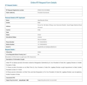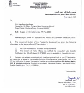 अजय वासुदेव बोस ने राष्ट्रपति कार्यालय में आरटीआई के तहत आवेदन देकर दो जानकारी मांगी। पहली यह कि पूर्व उपराष्ट्रपति जगदीप धनखड़ ने राष्ट्रपति से मिलने के लिए समय कब मांगा ? दूसरी यह कि राष्ट्रपति ने पूर्व उपराष्ट्रपति का इस्तीफा कब स्वीकार किया।