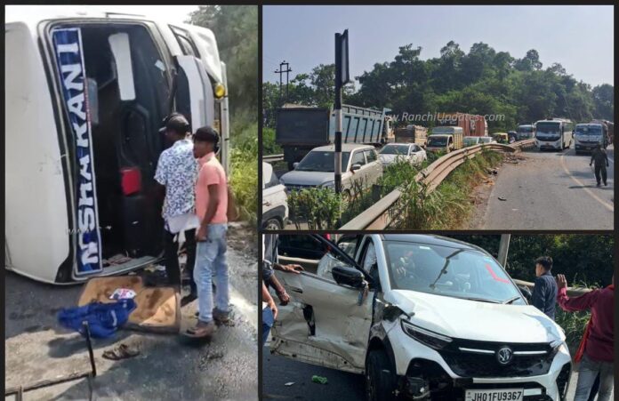 रामगढ़: रामगढ़ जिले के चुटूपालू घाटी मोड़ पर गुरुवार दोपहर एक बड़ा सड़क हादसा हो गया। एक ट्रेलर ने अपने आगे जा रही यात्री बस में जोरदार टक्कर मार दी, जिससे दोनों वाहन अनियंत्रित होकर पलट गए। टक्कर के बाद ट्रेलर डिवाइडर तोड़ते हुए सड़क किनारे पलट गया, जबकि बस भी पलटकर सड़क के किनारे जा गिरी। बस में करीब 30 से 40 यात्री सवार थे। हादसे में एक कार और एक टेंपो भी चपेट में आ गए। टक्कर लगते ही बस में चीख-पुकार मच गई।