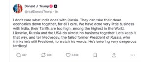 भारत: अमेरिका के राष्ट्रपति डोनाल्ड ट्रंप ने भारत और रूस की अर्थव्यवस्था को मृत्यु कहा जिसमें उन्होंने साफ शब्दों में स्पष्ट किया कि अमेरिका इन देशों के साथ व्यापार करने में कोई दिलचस्पी नहीं रखना और यह विवादास्पद टिप्पणी उसे वक्त आई जब अमेरिका ने भारत पर 25% टैरिफ और रूस के साथ व्यापार करने पर दंडात्मक कदम उठाने का घोषणा किया था।