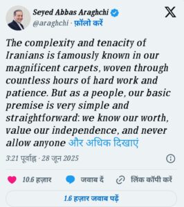ट्रंप के बयान पर ईरान के विदेश मंत्री अब्बास अराघची ने दो टूक जवाब देते हुए कहा कि ईरानी संस्कृति में धैर्य जरूर है, लेकिन अपमान बर्दाश्त नहीं किया जाता। उन्होंने कहा कि अगर ट्रंप वाकई समझौता चाहते हैं, तो उन्हें ईरान के सर्वोच्च नेता और जनता का सम्मान करना होगा।